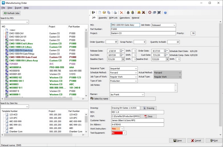 The example screen below shows a job with seven user fields. There are two use fields with buttons; Drawing and PDF. Clicking on the button will open the file . Note that the file location has the folder as well as the filename in the user field prompt. Two other lookup user fields are present; Work Instruction and Test Equipment. These lookup user fields have colors selected by the user where the foreground and background show in different colors depending on the lookup item selected: