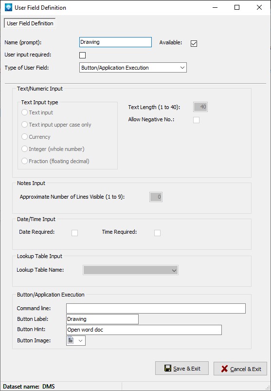 The example below shows the User Field Definition screen if Edit was selected. In the example below, the user fields is a Button/Application execution. The button will open the default Windows application depending on the file extension of the file being opened as the Command line is blank. The button label will appear on the screen with text of "Drawing", the button hint will be "Open word document" and the button image will appear as