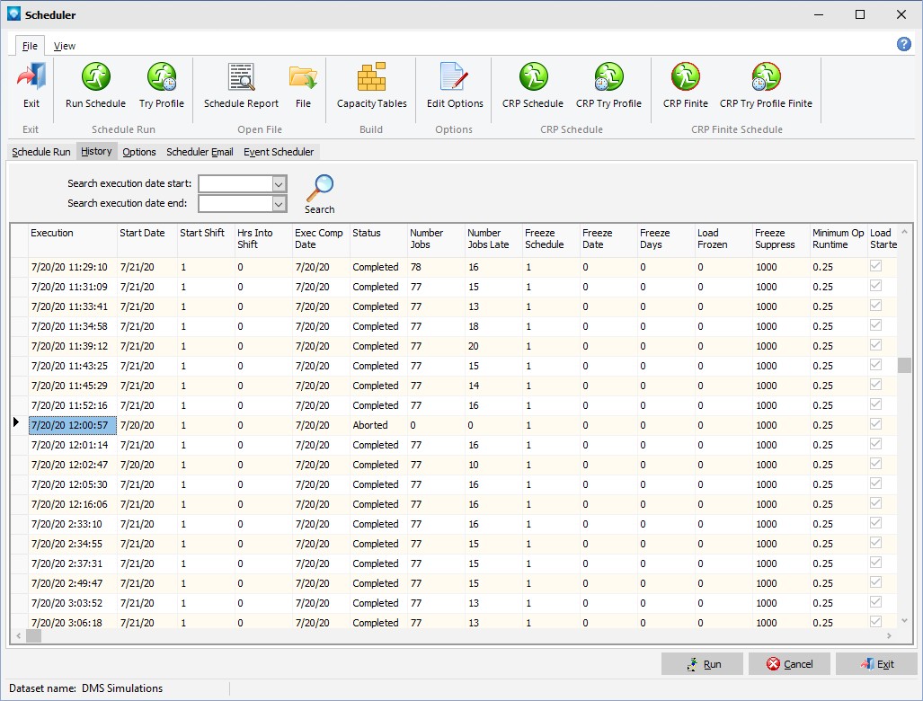An example of the History grid is shown below. Note that one run was aborted by the user: