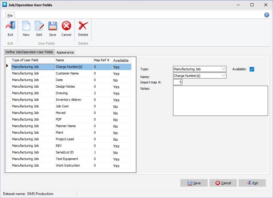 The Appearance is used to set the sequence of job user fields on the Manufacturing Order job tab.