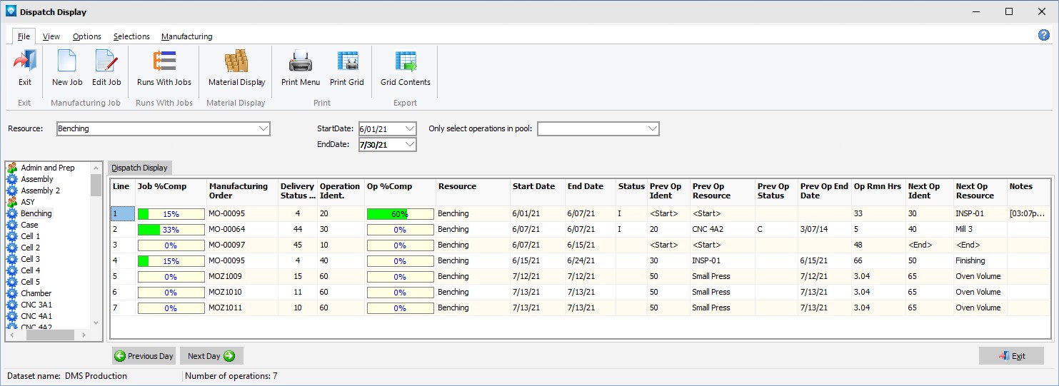 The Dispatch Display shows the work assign to a resource for a given time period. The dispatch is independent of the selections made in Manufacturing Orders Job Grid. When the Dispatch Display appears, the default start date and end date are set to the first day of the schedule and the first resource (sorted alphabetically) is displayed on the screen. The columns displayed are set in the Dispatch Display Grid Selections.