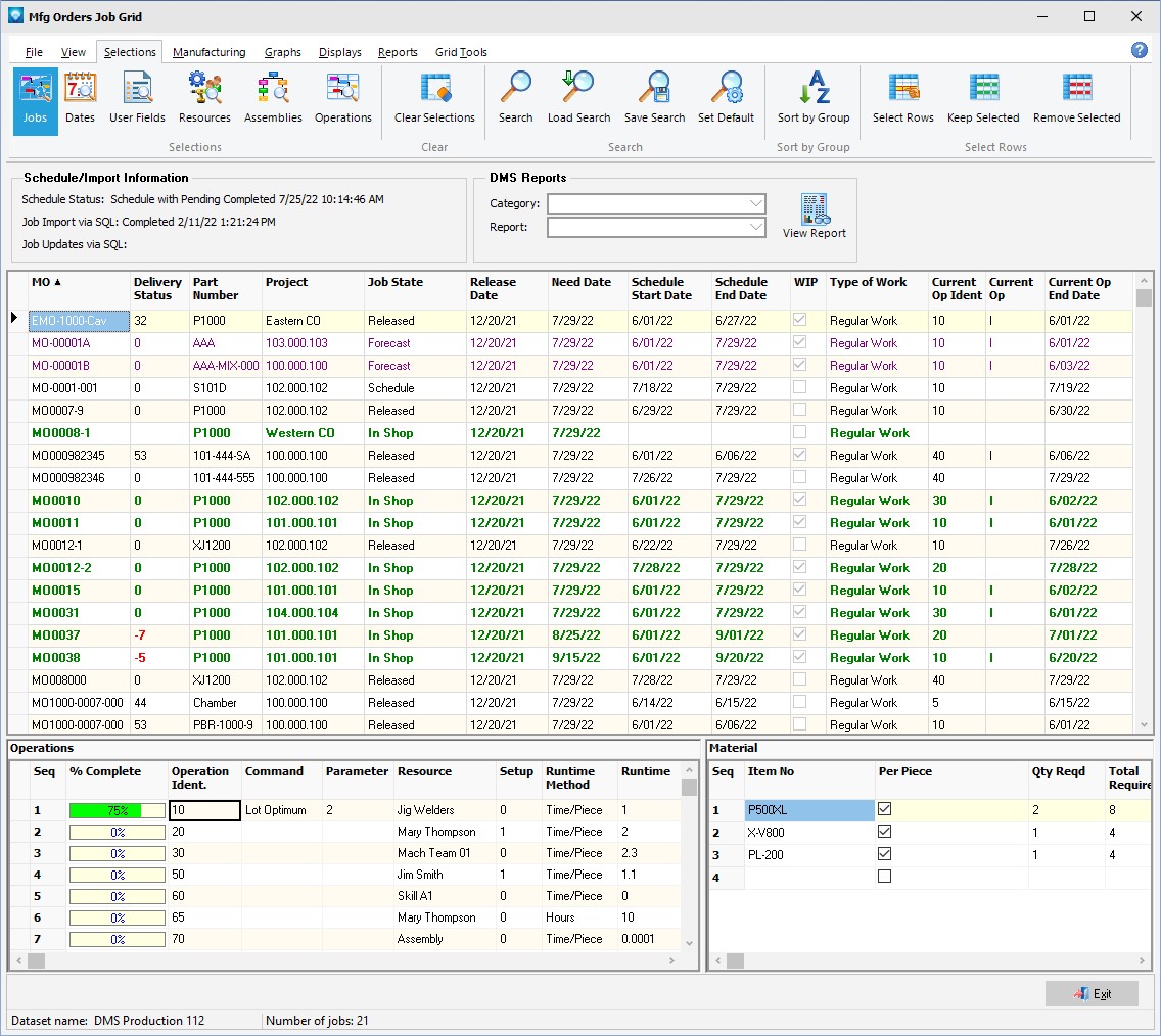 Note that depending on a job's state, the display color of the job can be different. The display color and job states are defined using Job States. Above the gird listing of jobs, the schedule start date, schedule start shift, schedule run type and the date the schedule was last executed are displayed. There is also a DMS Reports group box where you can select a report to be printed or displayed. You can also use the Reports tab to View and print reports.