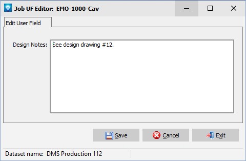 If the Edit is selected, the Job User Field editor is displayed. The appearance of the Job User Field Editor will depend on the type of user field selected for editing. For example, a Text user field will have a single text line to edit, a Notes user field will appear in a memo box with multiple lines, a Lookup user field will have a dropdown menu of valid items to select, a Date or Time user field will display a date/time selection and a Button/Application user field will prompt for the file to execute.