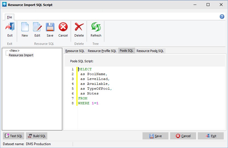 The Resource Import SQL Scripts enables you to define SQL scripts to import resources into DMS. This import can be used to add new resources to DMS and to change existing resources. Before you add the SQL scripts, one or more connection strings must be defined. Any number of SQL import scripts can be defined. For help writing SQL scripts in DMS please see Hints and Tips Writing SQL Scripts in the help documentation. For details on the SQL columns required for the import, please see SQL Resource Import Columns Required.
