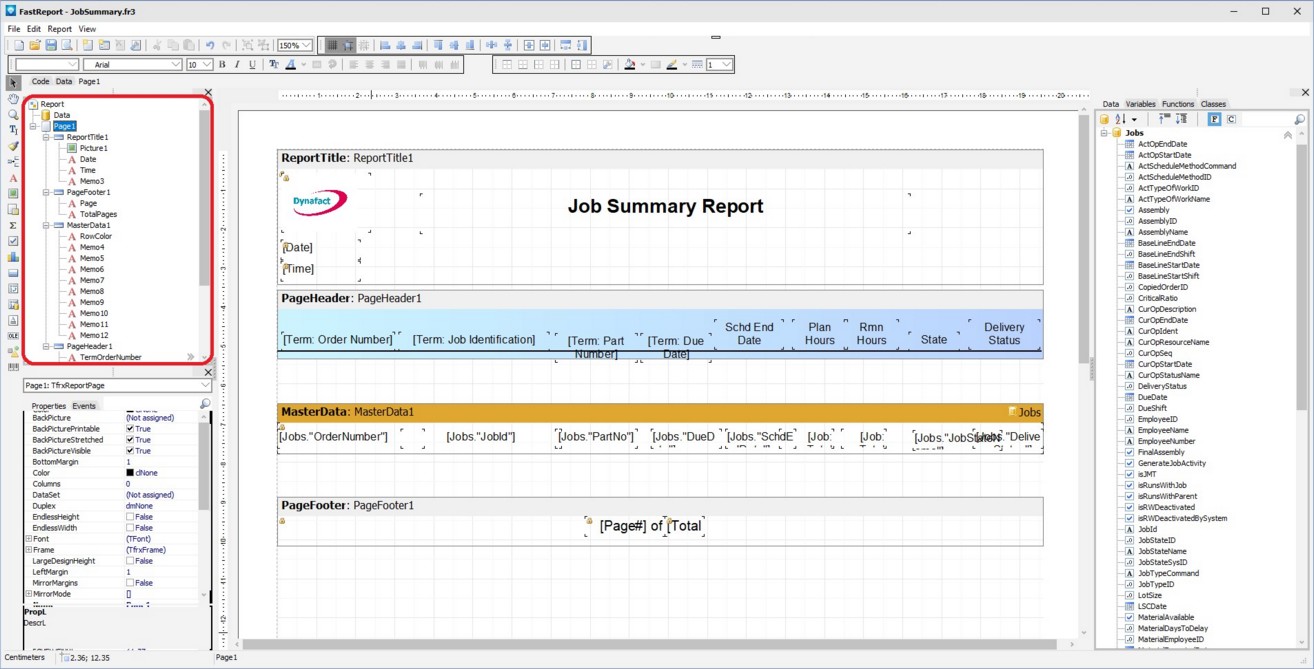 The list of report objects accessible from the script is shown in the “Report tree” pane. To view the Report Tree, select View | Toolbars | Report Tree. The example below shows the Report Tree circled in red at the top left side of the Report Designer:
