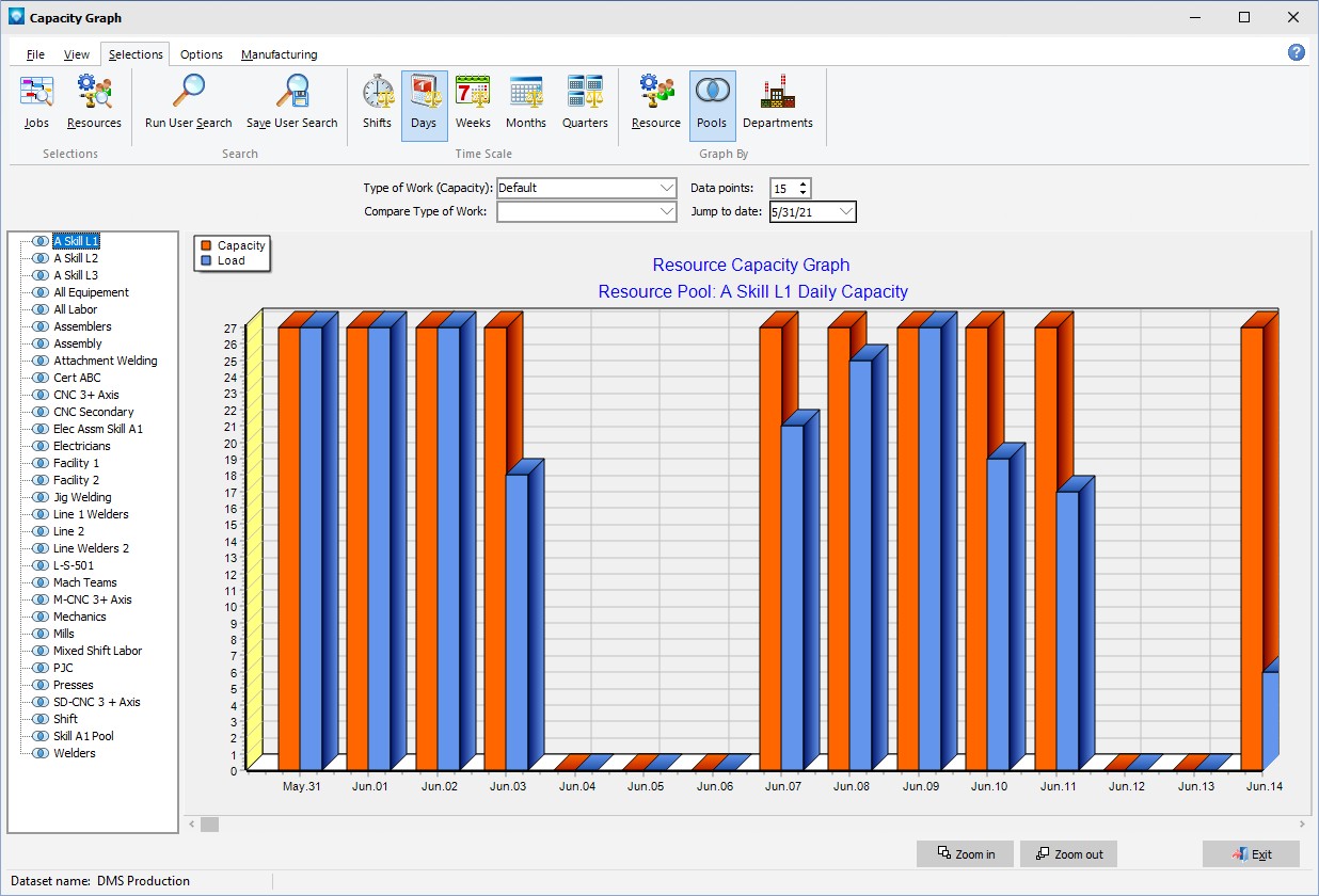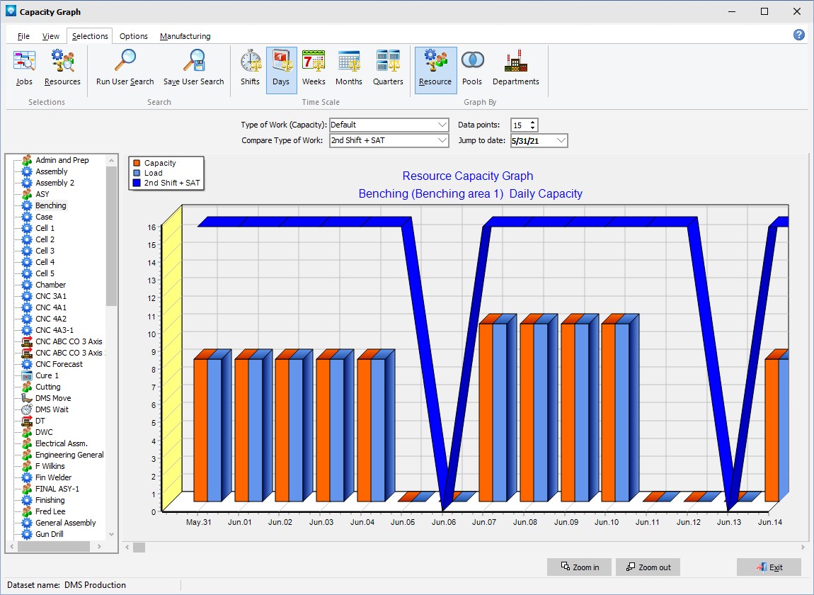 6.Graph by Resources Select Selections | Graph by Resources to display the capacity graph by resource.