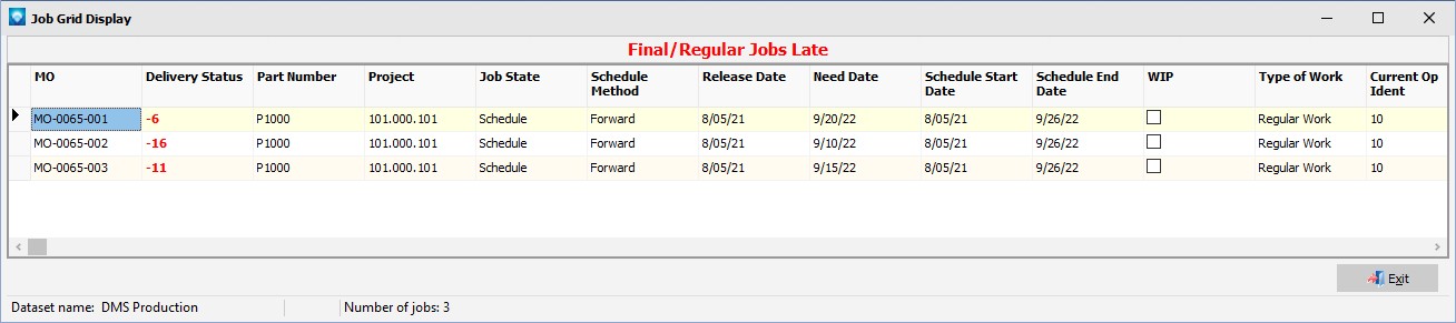 Depending on the pie slice you clicked on, the Job Grid Display will display the title of the corresponding pie slice.  In the example below, the user clicked on the pie chart slice for jobs on time: