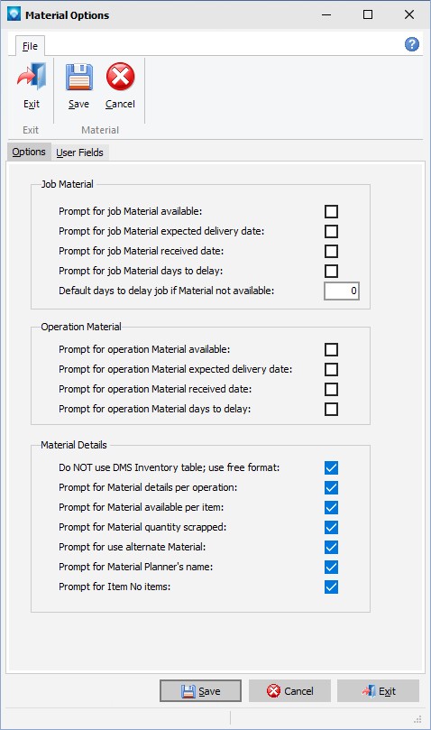 The example screen below shows the User Fields tab in Material options: