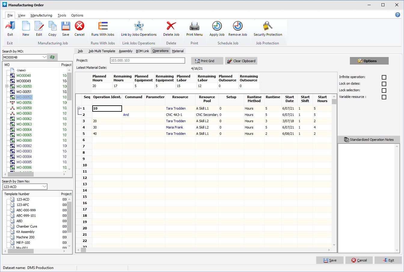 The Operations tab in Manufacturing Order contains all the operation details in the operation grid and an optional display down the right side of the screen that shows the operation's options and operation's notes. You can also display the total hours for the job and by resource type using the Total Hours Grid Selections. The appearance of the operation tab will depend on what terms you have changed, which operation fields you have selected to be displayed, and if you have any operation user fields. For detailed information on editing cells in the the grid and copy and paste commands, see Operation Grid Editing.