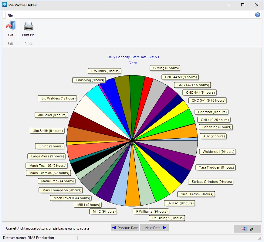 When the profile pie chart details are in view, all the underlying view commands work except the 3D setting. This enables you to view the details and make changes to the detailed pie chart. The previous and next date buttons on the Shop Load Profile Graph are also active when the detailed profile pie is displayed and will display the previous/next day on the profile pie.