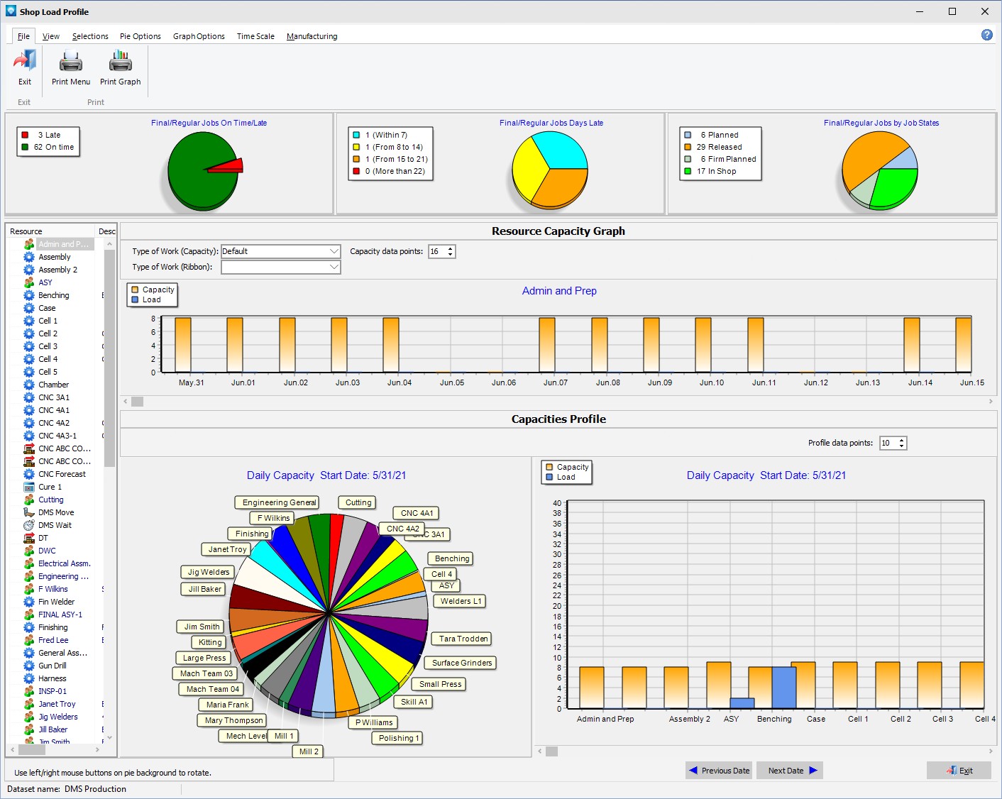 The Shop Load Profile Graph consists of four pie charts and two bar capacity bar charts. The pie charts display: