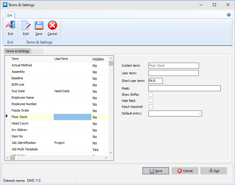 Terms and Settings are used to set your own terms that will be used in DMS, as well as other attributes such as hiding fields that will not be used.