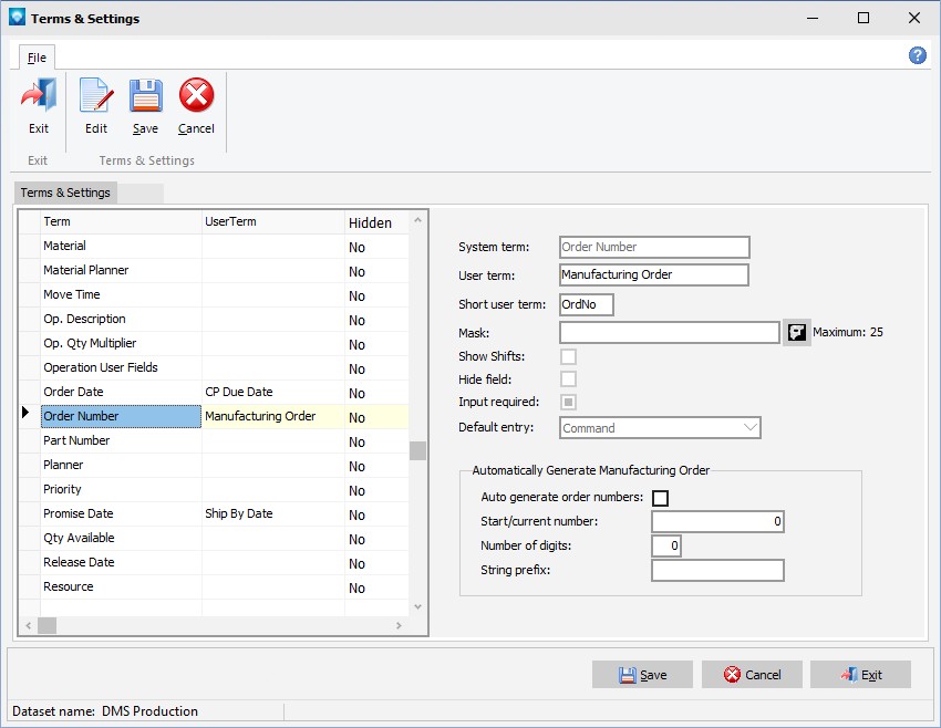7.Hide Field Select this checkbox if you do not want to hide the term and the features that go with it. For example, if you do not use Assembly jobs, you can hide Assembly and the Assembly tab will not appear in Manufacturing Order. Certain fields, such as Due Date, cannot be hidden as they are required by DMS.