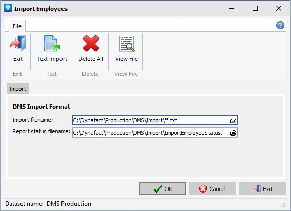 2.Report status filename Enter a filename where the report status will be written or press enter to take the default filename of ImportEmployeeStatus.TXT. DMS writes the status of the import to the file entered to this prompt. Import errors with the offending import line are written to this file.