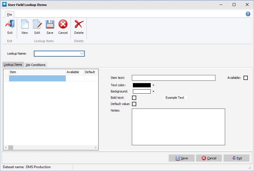 Once a User Field Lookup Item has been defined and is used by DMS, it cannot be deleted unless the job/operation user fields using the item are assigned to another item. Instead of deleting a User Field Lookup Item you can make it unavailable for use by unselecting the Available checkbox.