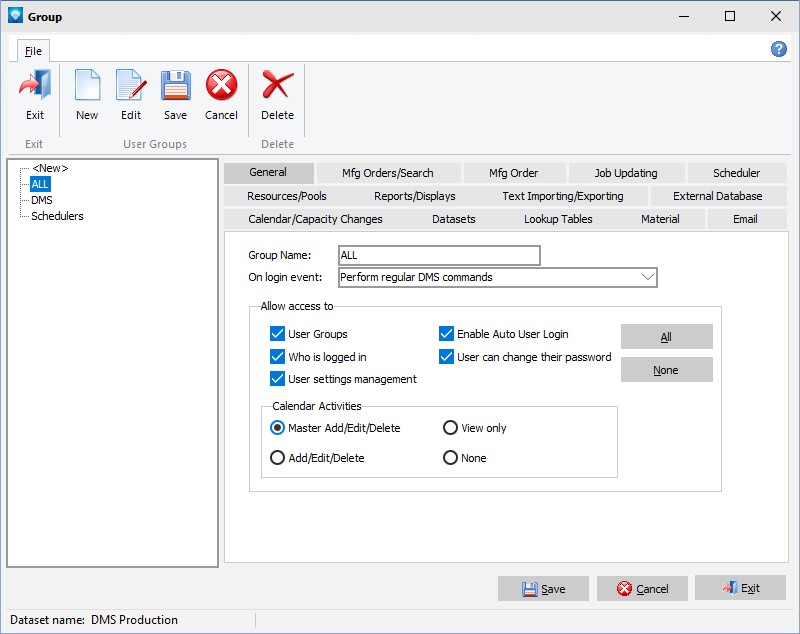 DMS enables you to specify that a user group is to be limited to one of two commands when a user logs in; either Quick Job Updating or the Start/Stop Clock Job Updating, or to automatically execute a DMS command such as going directly to Mfg Orders Job Grid. There are 29 login DMS commands on the General tab for User Groups.